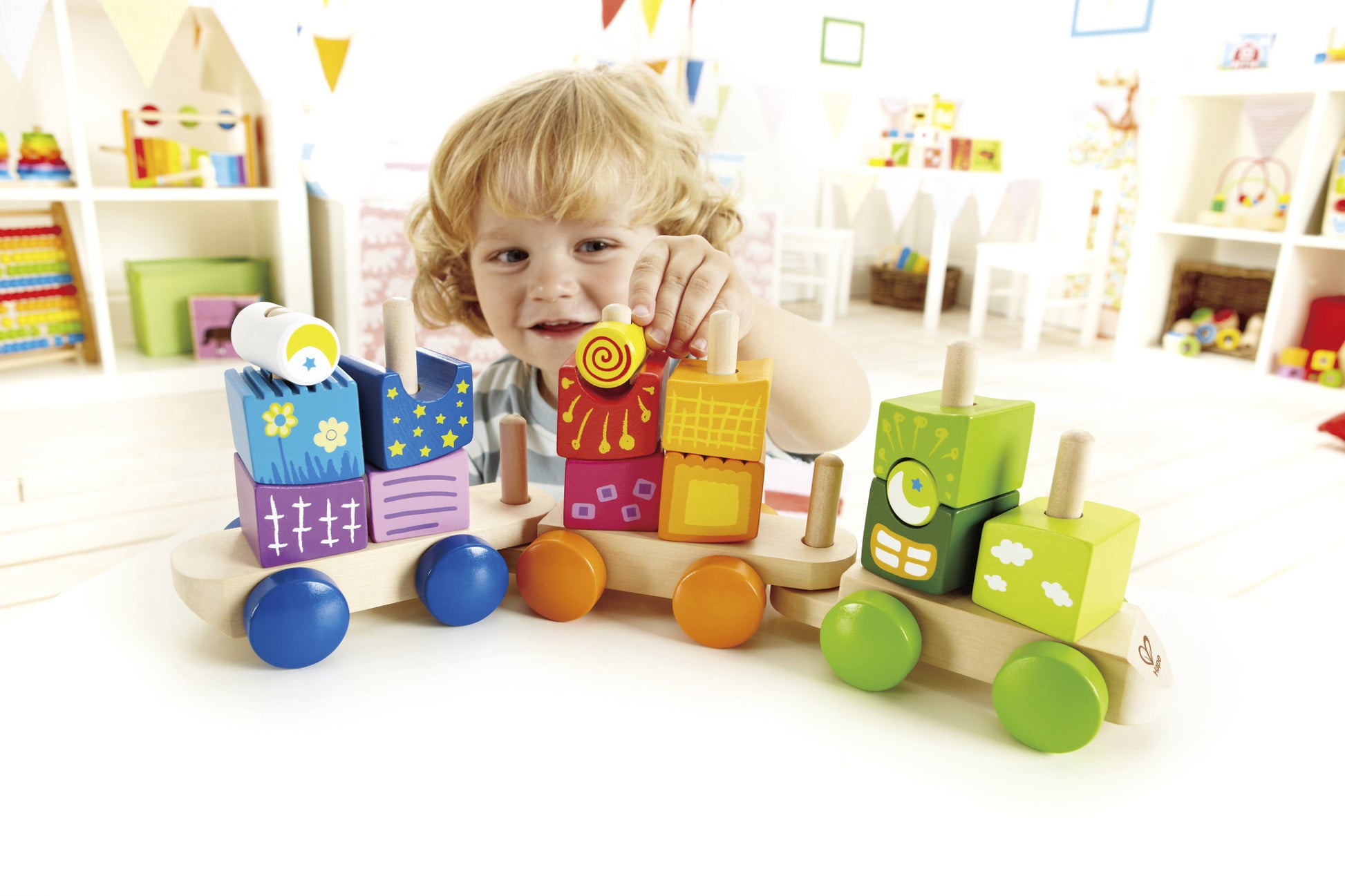 - 17-piece maple block train – A classic wooden train with colorful blocks to stack, build, and roll.