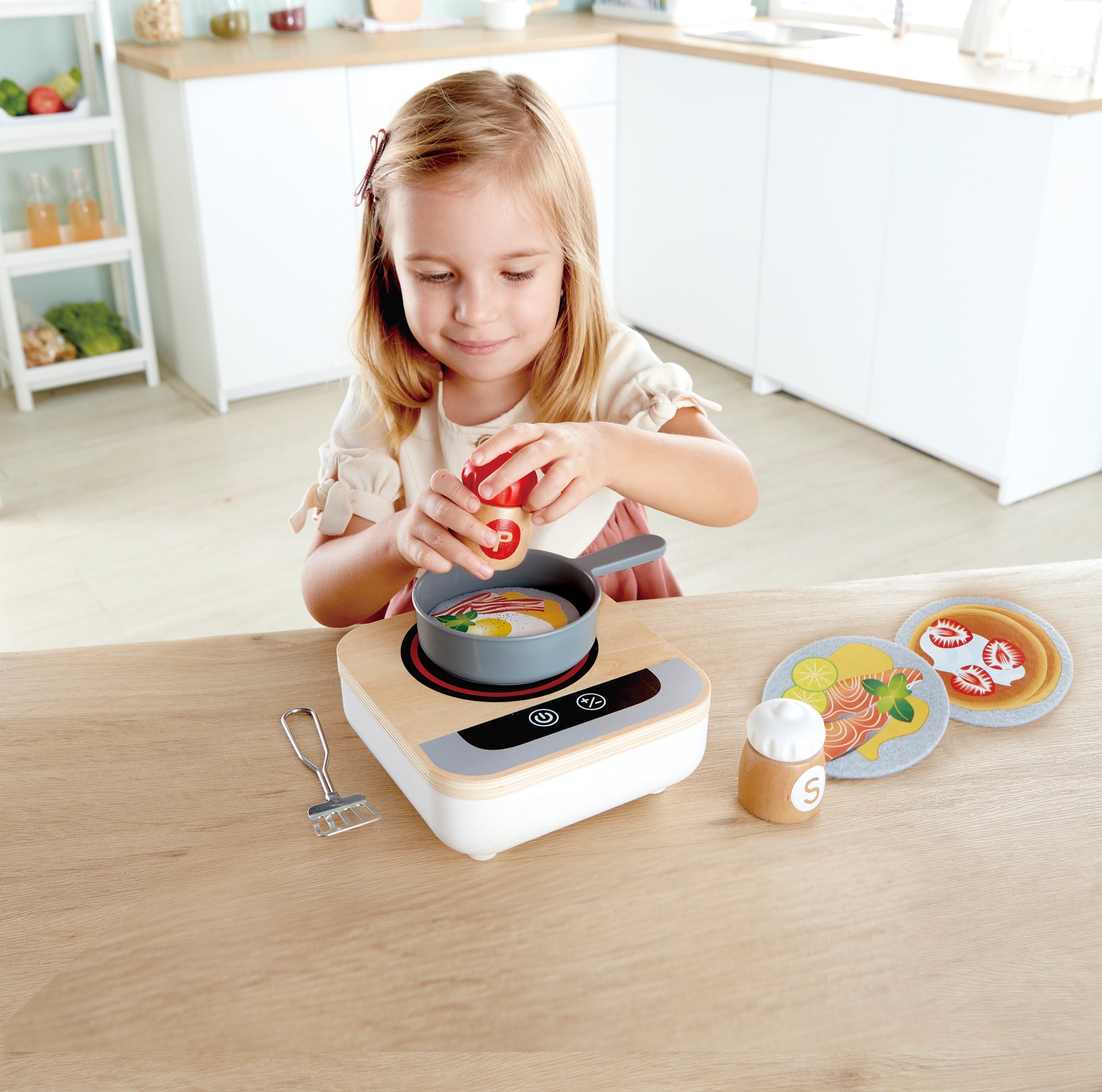 - Includes a stove top, a pan, salt and pepper shakers, 3 food entrees, and a spatula.