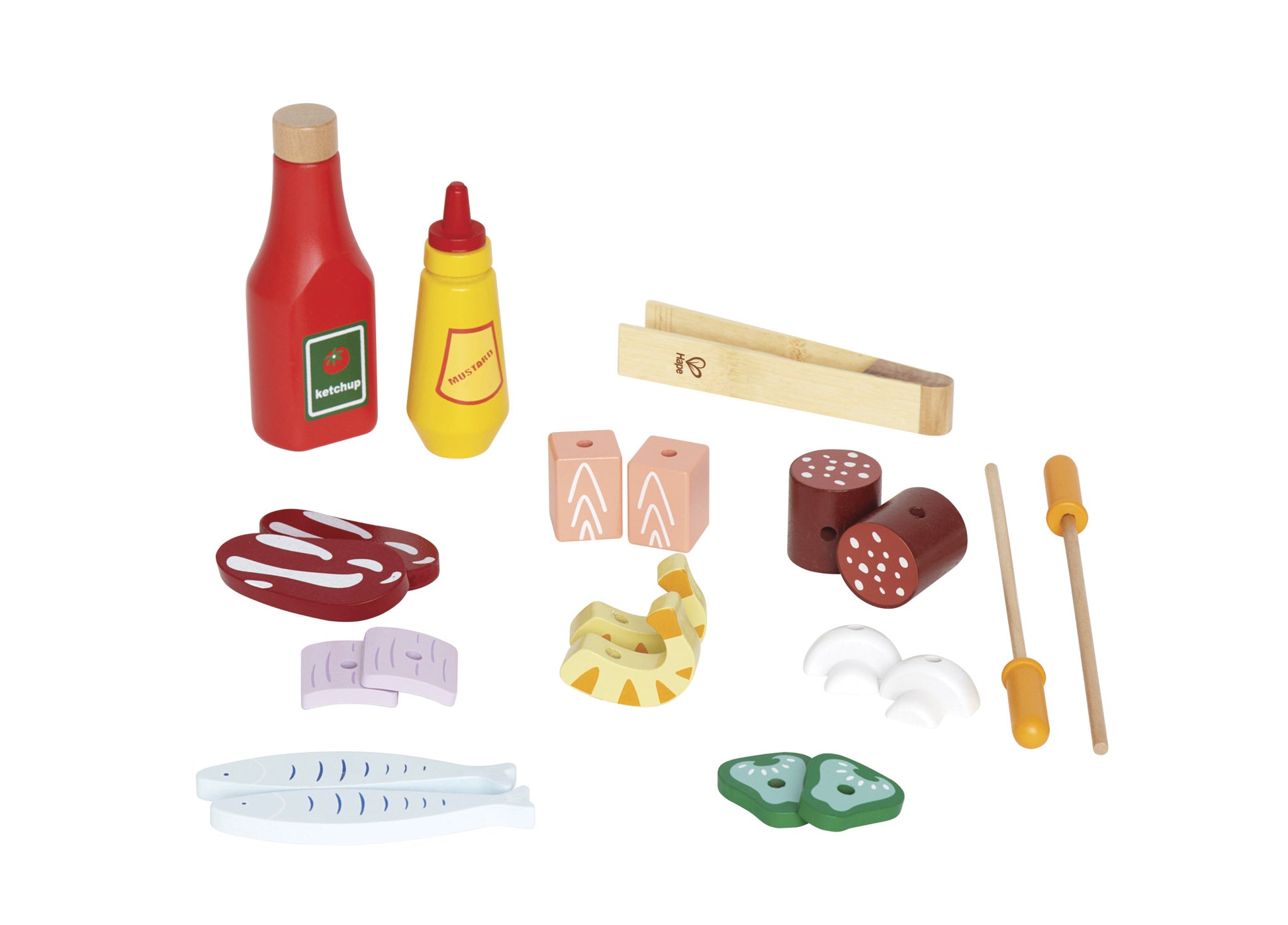 - This kid's grill set has everything your little one needs to throw a delicious backyard BBQ. Two skewers, as well as slices of meat and vegetables, are included.